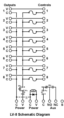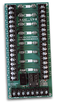 The LV-8 distributes power to 8 door locks directly controlled by an Access Control System (without isolation relays). A socket and terminals are provided for an optional Disconnect relay that can drop power to fail-safe locks when interfaced to a fire or life safety system.