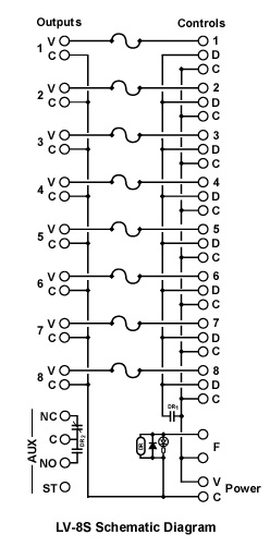 The LV-8S distributes power to 8 door locks directly controlled by an Access Control System (without isolation relays). A socket and terminals are provided for an optional Disconnect relay that can drop power to fail-safe locks when interfaced to a fire or life safety system.